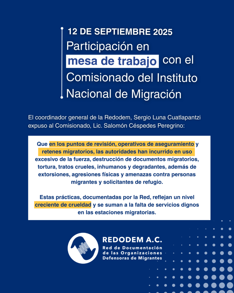 Contacto Contacto Participación en mesa de trabajo con el comisionado del Instituto Nacional de Migración ¿QUIERES AYUDAR? Tu apoyo es fundamental para continuar el importante trabajo que realiza la REDODEM en favor de las personas en contexto de movilidad. Si deseas sumarte a esta causa y marcar una diferencia tangible, te invitamos a considerar una […]