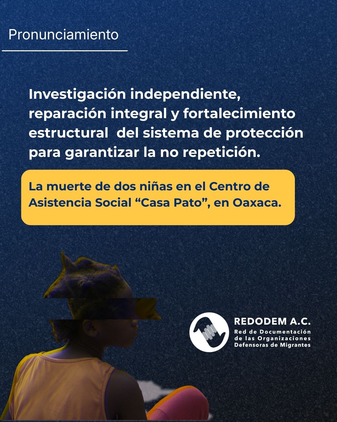 Expresamos nuestro profundo dolor y consternación por el fallecimiento de dos niñas en el Centro de Asistencia Social (CAS) “Casa Pato”, espacio de alojamiento y asistencia destinado a brindar resguardo y atención a niñas, niños y adolescentes en movilidad humana forzada y sus familias, administrado por el Sistema DIF Estatal de Oaxaca. Esta tragedia no solo representa una pérdida irreparable, sino que evidencia fallas graves en la protección de la niñez bajo cuidado institucional y un riesgo inadmisible para niñas, niños, adolescentes y sus familias en contextos de movilidad